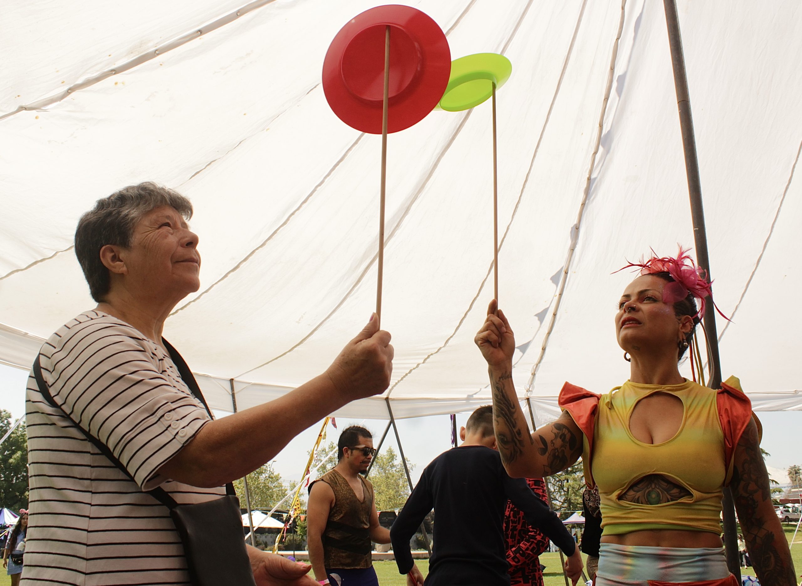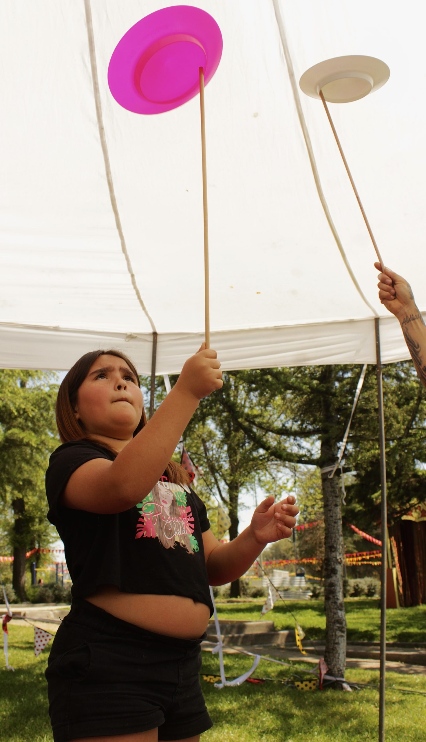Juega y aprende con los diferentes juguetes de circo tales como; platos chinos, banderitas, clavas y diabolos